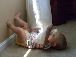 I wanted to add a few other pictures from over the weekend. As you can see below we will not be able to leave Ella on the floor in our room while we get ready in the am. I get ready and leave and then Ella is home with Tom in the am while he gets ready for work. She has been rolling all over our room getting into things while were in the shower! This past week we have found her playing in the curtains (as seen below), I also have a jewelry chest on the floor that has small drawers and on two different occassions she has pulled out the bottom two drawers! We didnt even know she was able to do this and luckily the drawers are small and the bottom two do no contain items small enough to choke on! What a stinker!